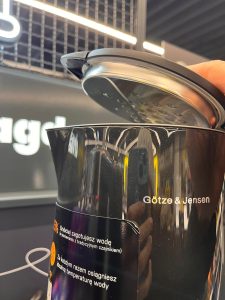 Najdroższym, ale też najbardziej zaawansowanym z czajników GÖTZE&JENSEN jest ten model o pojemności 1,5 litra i mocy aż 3000W. To co go wyróżnia to możliwość sterowania telefonem z użyciem aplikacji SETTI+ oraz stalowe, wyjmowane sitko. Przy czym zazwyczaj sitka stalowe w czajnikach ciężko nazwać sitkami, bo otwory są tak duże, że i tam przepuszczają większość osadu z kamienia, którego chcielibyśmy uniknąć. Tym razem mamy prawdziwe sitko o maleńkiej siateczce.